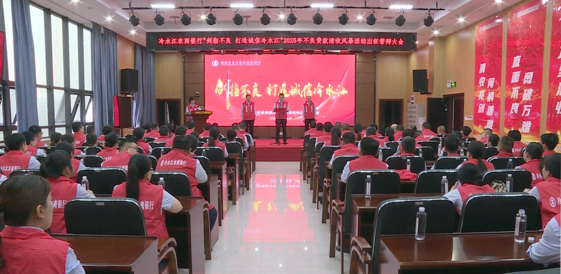 新冷水江9月23日讯(赵晶晶)22日,冷水江市农商银行开展“剑指不良 打造诚信冷水江”2025年不良贷款清收风暴活动出征誓师大会。大会进行了现场授旗,全行100余人宣读了誓词。市农商银行相关负责人强调,全行上下必须高度重视此次“清收风暴”行动,将政治自觉转化为行动自觉,全力以赴投入战斗;要强化组织领导,压实清收责任,做到每日一通报,动态跟踪进度;要摸清底数,综合运用行政、法律、经济、舆论等手段,提高清收精准度;要加强内外联动,凝聚清收合力,全力以赴打好这场“清收之战”,助推全市经济社会高质量发展。