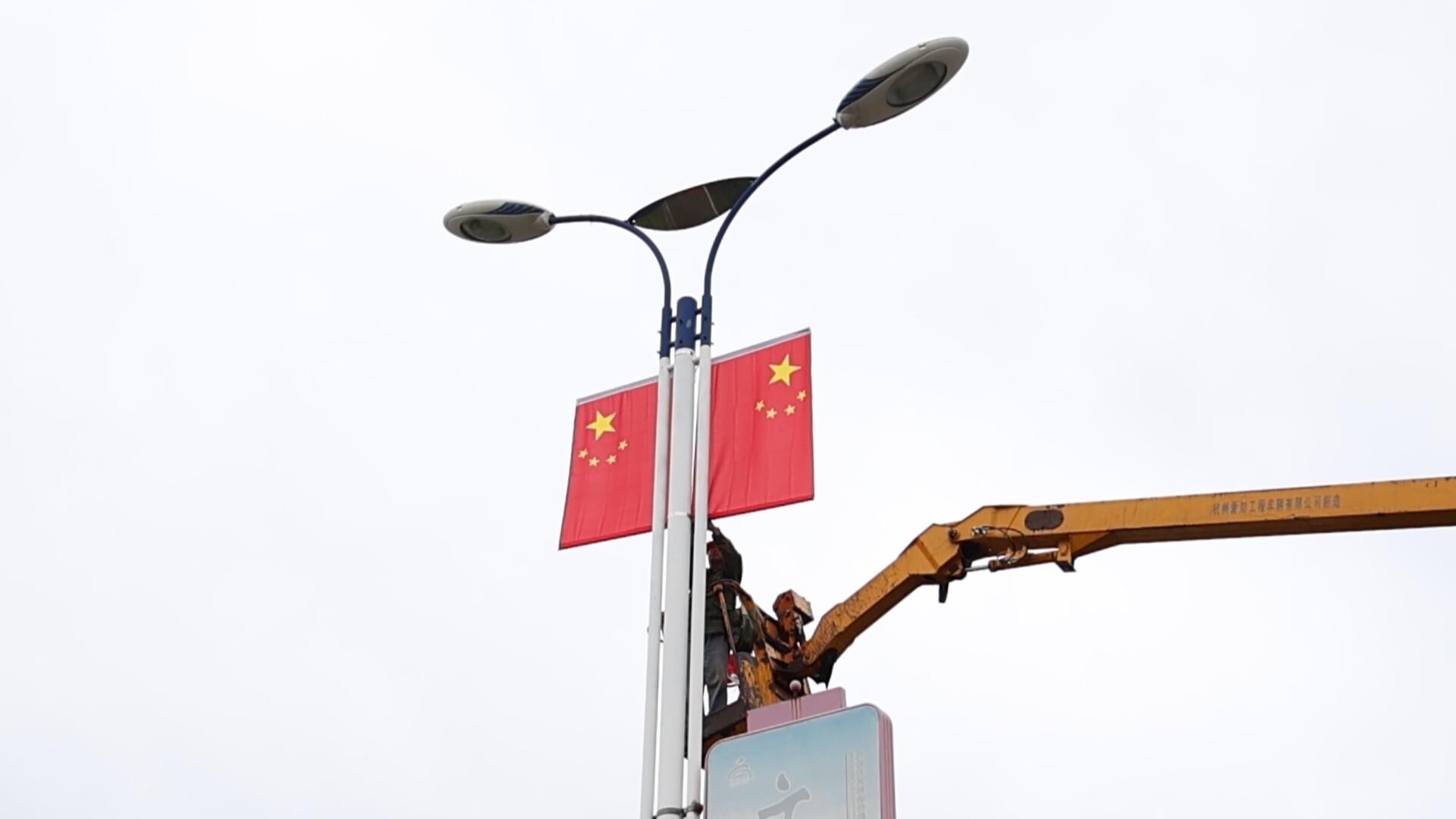 记者在施工现场看到,市政工人正在高空作业车上忙着悬挂国旗。在每一盏路灯的两侧,悬挂的国旗整齐对称,在秋风中猎猎作响,鲜艳的红色与周围的绿树及城市建筑交相辉映,形成一道亮丽的风景线。