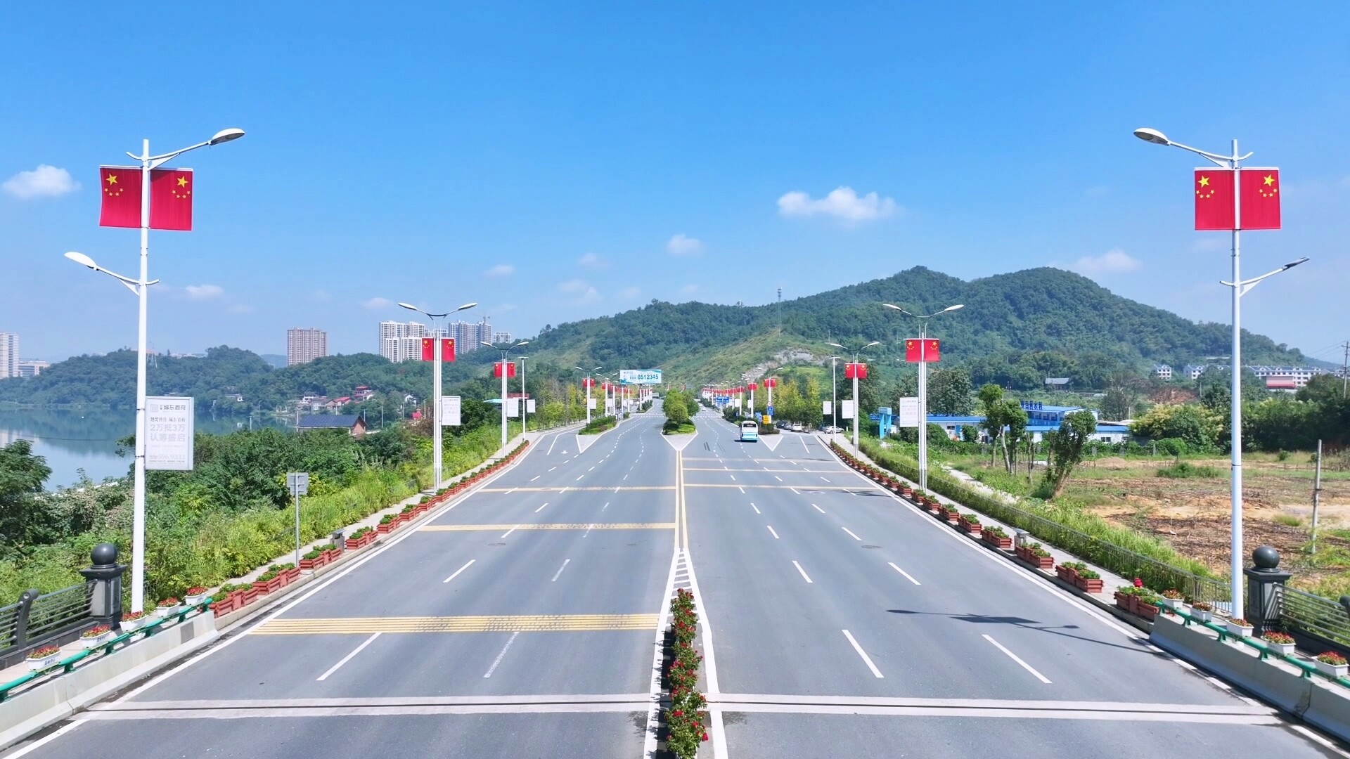 实习记者陈诗雨说:“大家好,我现在所在的位置是新城大桥。行走在这里,扑面而来的就是浓浓的国庆氛围,您看,道路两旁的路灯杆上,一面面鲜艳的五星红旗迎风招展,红得热烈,红得耀眼,像是在向过往行人传递着节日的祝福。”