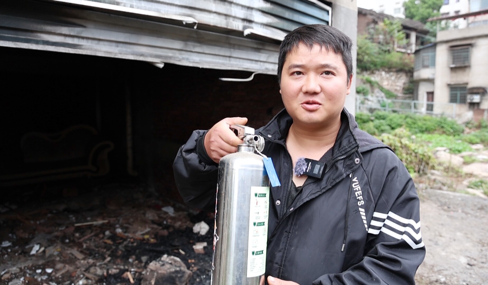 红日社区灭火群众谢翔说:“我是红日社区的消防志愿者,平时社区帮我们搞了培训,帮我们每个人都买了个灭火器,这次就派上了用场。”