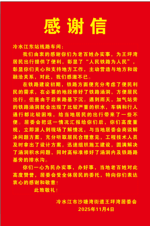 王坪湾居委会将这一情况报告市委政法委和冷水江东站线路车间后,市委政法委和冷水江东站高度重视,第一时间派人到现场勘察。车间工程技术人员与居委会、居民代表多次沟通,充分听取居民合理意见,迅速制定出科学的设计方案,并立即组织施工建设。经过紧张施工,不仅涵洞积水问题被圆满解决,车间还高标准修建了涵洞内及铁路路基旁的排水沟,从根本上消除了积水,让居民出行恢复顺畅,消除了该地段的安全隐患。