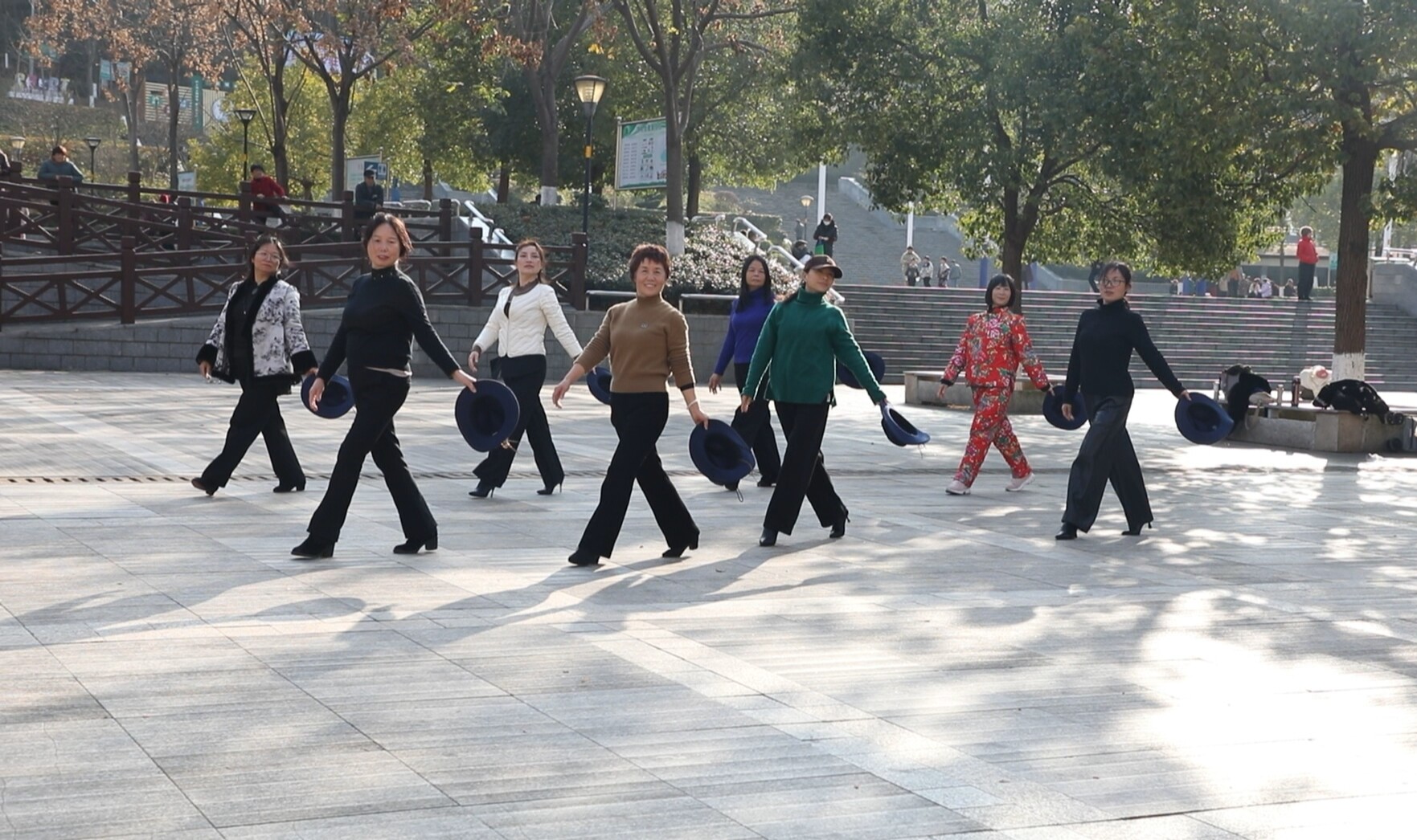 不远处的广场上,另一道风景同样引人注目。玲姿舞队的二十余位队员踏着旋律款款而行。她们步伐轻盈、姿态从容,仿佛走在春光里。