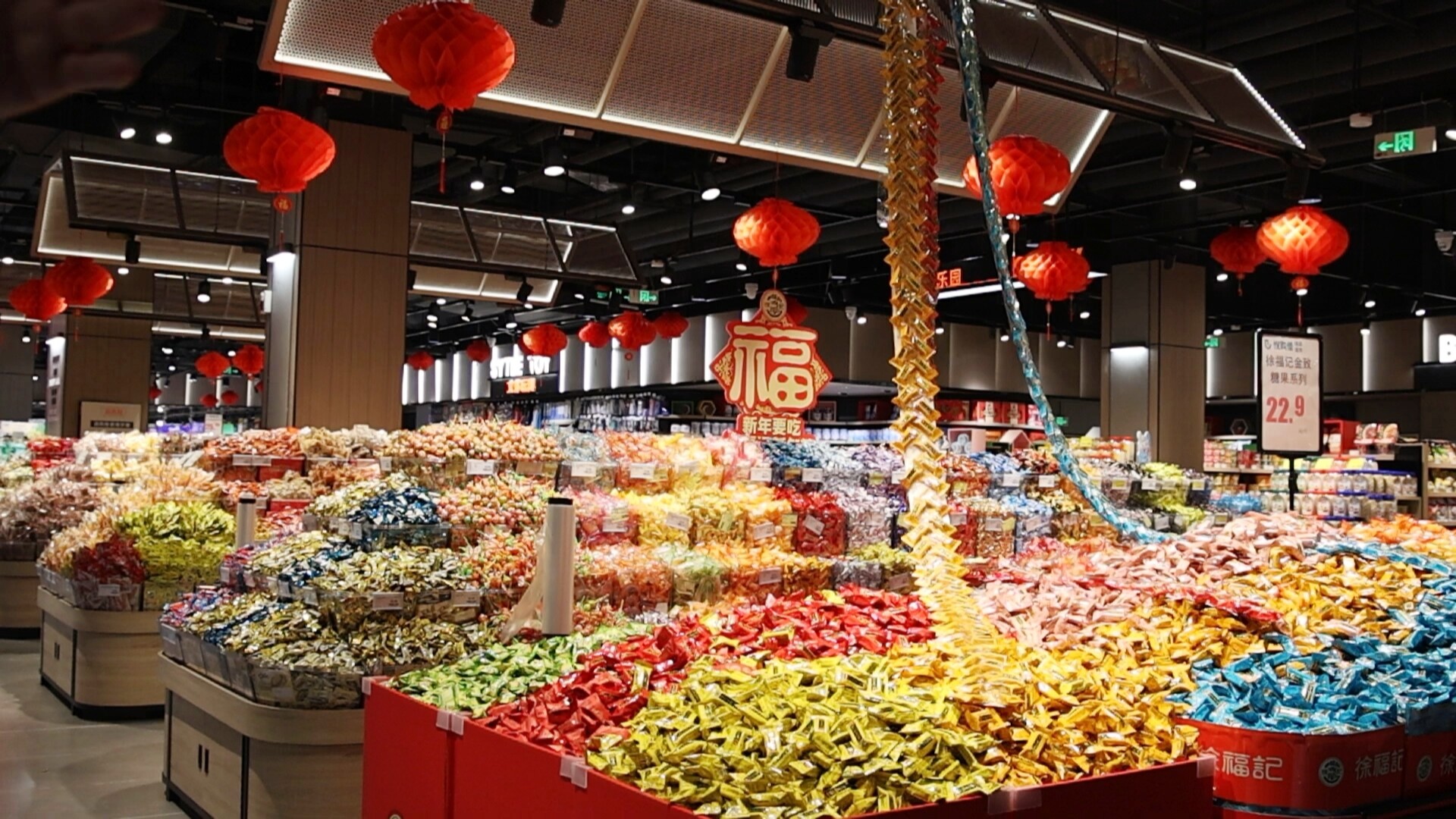 超市店长何益辉说:“毕竟过年要有氛围,陈列也是以喜庆,红色的一条线过去。”
