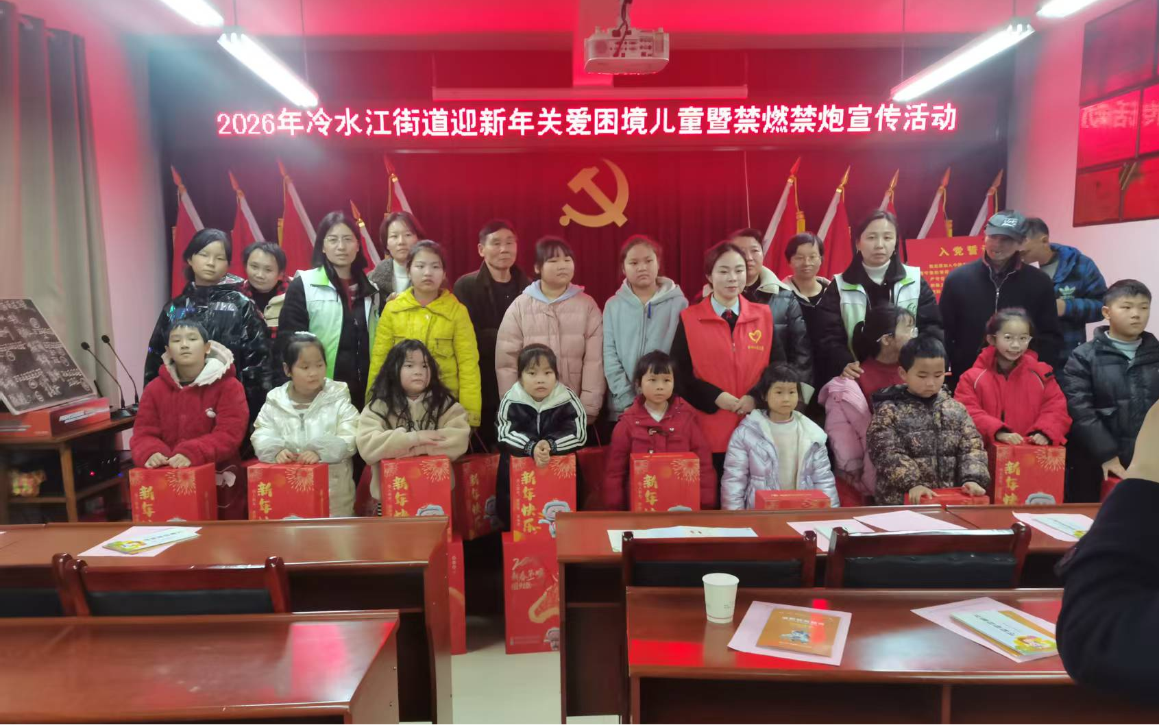 同时,冷水江街道坚持“暖心慰问”与“安全守护”两手抓,将走访困难群体与全域禁炮宣传深度融合。2月13日,冷水江街道联合冷水江农商银行、民政社工站,深入冷园社区开展新春送温暖——关爱困境儿童暨禁燃禁放宣传活动,他们“带着物资上门、揣着政策入户”,为16名困境儿童送上精心准备的新春关爱礼包,包括崭新的书包、实用的运动礼包以及暖手宝等物资,在发放爱心物资的同时,社工还向孩子们及家长耐心讲解禁燃禁放相关规定,普及燃放烟花爆竹的安全隐患和消防安全知识,引导大家自觉遵守禁燃禁放要求,用暖心服务传递民生温度,护航未成年人健康成长。