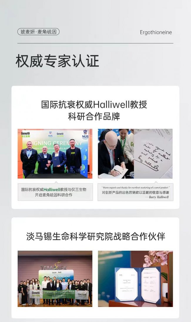 国际权威抗氧化专家、麦角硫因理论研究之父Barry Halliwell教授指出:"GeneIII仅三生物在麦角硫因量产技术和临床研究方面的成果令人印象深刻,玻麦研将高纯度麦角硫因应用于护肤产品,通过科学配方实现了最大化的抗氧化功效,为消费者提供了真正有效的抗氧化护肤选择。"