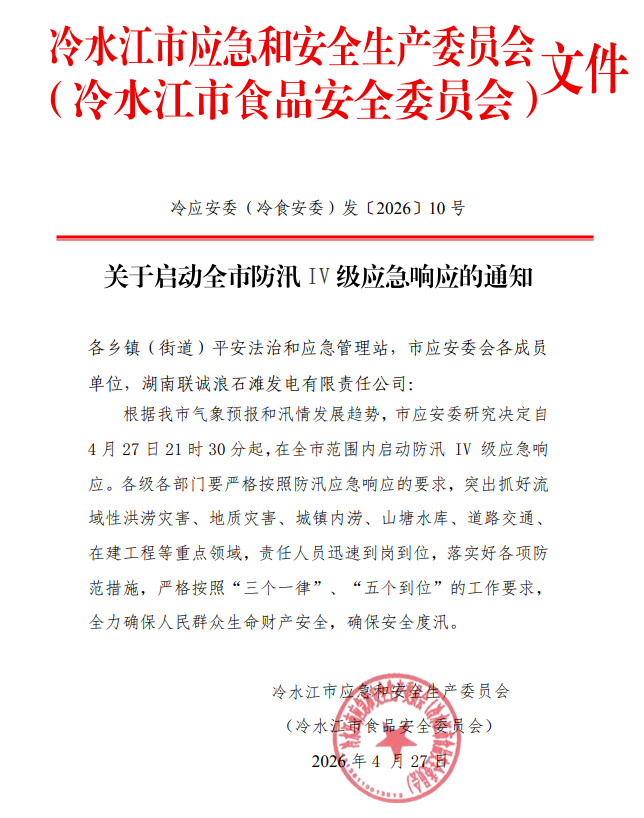 根据我市气象预报和汛情发展趋势,市应安委研究决定自4月27日21时30分起,在全市范围内启动防汛Ⅳ级应急响应。各级各部门要严格按照防汛应急响应的要求,突出抓好流域性洪涝灾害、地质灾害、城镇内涝、山塘水库、道路交通、在建工程等重点领域,责任人员迅速到岗到位,落实好各项防范措施,严格按照“三个一律”、“五个到位”的工作要求,全力确保人民群众生命财产安全,确保安全度汛。