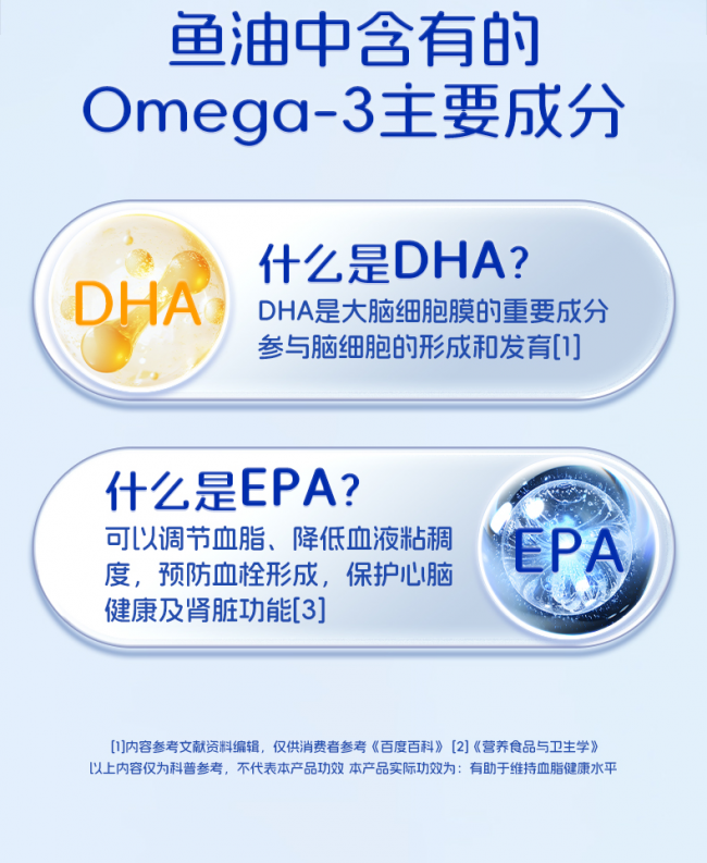 2.真实高含量与科学配比:以DHA和EPA为主,实测数据公布,Omega-3总含量优于同类,黄金比配协同,剂量精准,兼顾心脑血管、脑力、视力多元需求。