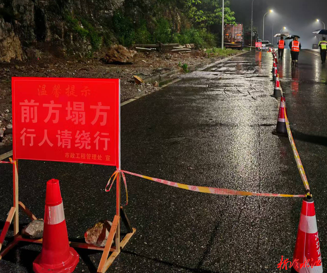 暴雨夜山体落石侵占车道 冷水江市政连夜抢险保畅通