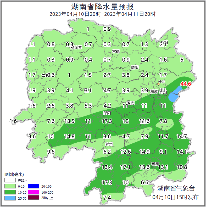 10日20时至11日20时,湘中、湘南阴天有小到中等阵雨或雷阵雨,株洲北部、长沙东部局地大雨,其他地区阴天间多云有阵雨;南风3~4级转北风3~4级,雷雨时局地阵风6级;最高气温23~25℃;最低气温湘西15~17℃,其他地区17~19℃。